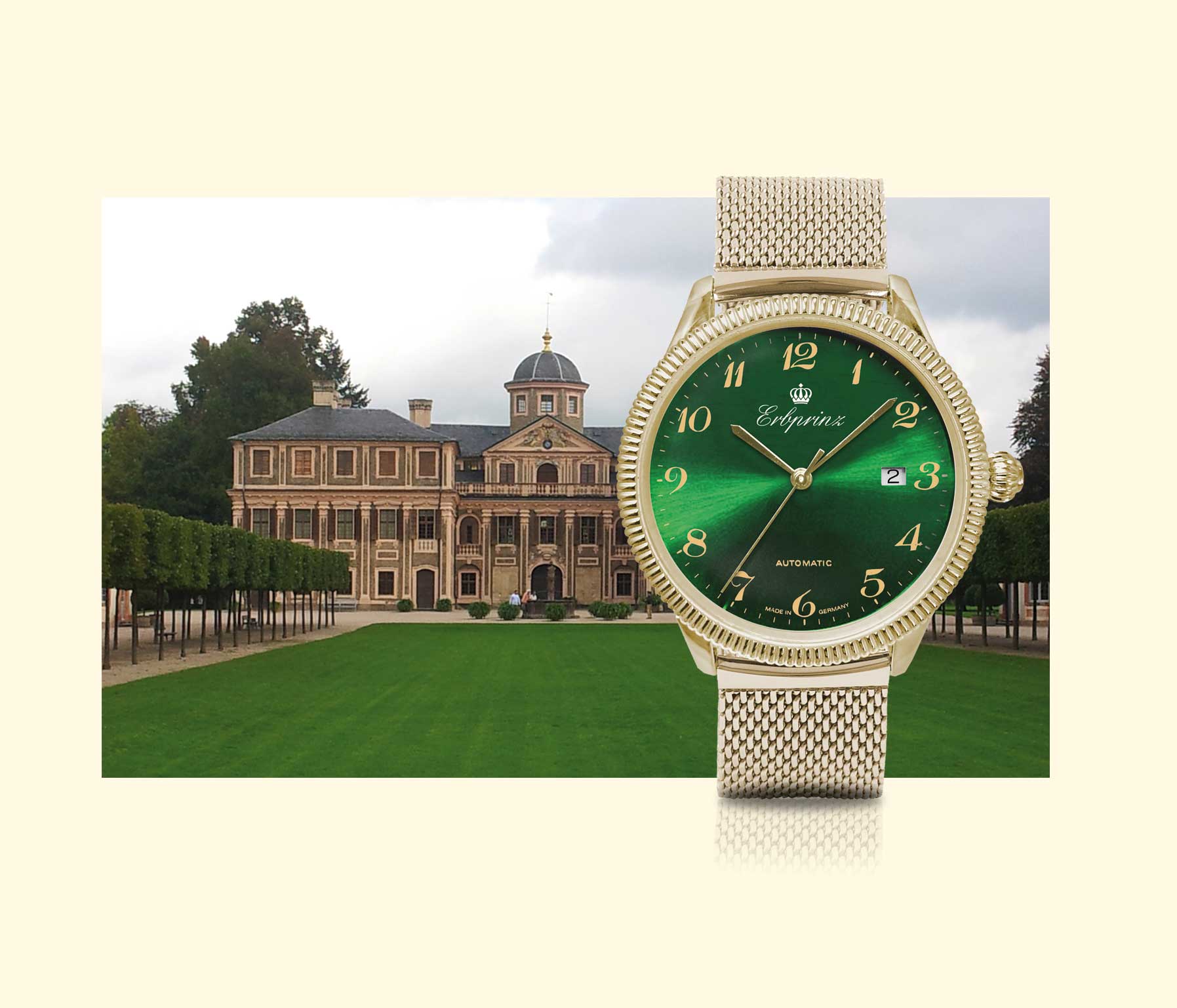 Mit der Uhrenserie „Erbprinz“ würdigt die ARISTO VOLLMER GmbH jenen Karl Friedrich von Baden, der 1767 in Pforzheim eine Uhren- und Schmuckmanufaktur gründete. Damit legte dieser Großherzog den Grundstein für die heutige Bedeutung von Pforzheim als Uhren- und Schmuckstadt. Schloss Favorite ist jenes erste deutsche „Porzellanschloss“, das die Markgräfin Sibylla Augusta von Baden-Baden vor den Toren von Rastatt hatte bauen lassen. Zum Ende des 18. Jahrhunderts, als der Favorite-Schlossgarten zu einem barocken Landschaftsbild umgestaltet wurde, erfand Abraham Louis Breguet das erste automatische Uhrwerk. Hansjörg Vollmer:„Eine Uhr, die den Geist dieser Epoche widerspiegeln soll, muss unbedingt mit Breguet-Zeigern ausgestattet sein.“ Diese feingliedrigen Zeiger sind nach dem legendären Schweizer Uhrmacher benannt. Breguet zählte auch zu den berühmtesten Finisseuren der Uhrmacher-Geschichte. Die umlaufende Dekorierung am Uhrgehäuse der Erbprinz „Favorite“ erinnert an die Formensprache des legendären Uhrenmachers. Beim Innenleben seiner Erbprinz-Uhren duldet Vollmer jedoch keine nostalgischen Kompromisse. „Das ARISTO Signaturwerk ist ein ausgereiftes ETA Kaliber 2824-2. Es wird in der Uhrmacher-Werkstatt in der Pforzheimer Erbprinzenstraße montiert.